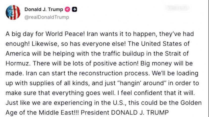 Trump dice haber acordado un alto el fuego de dos semanas con Irán