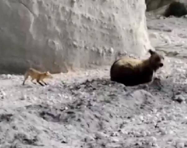 Se viraliza video de llamativa interacción entre un zorro y un oso