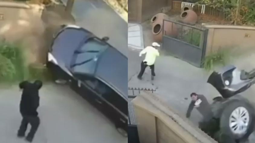 Impactante volcamiento de un auto en San Felipe: Hombres se salvaron por centímetros de ser atropellados