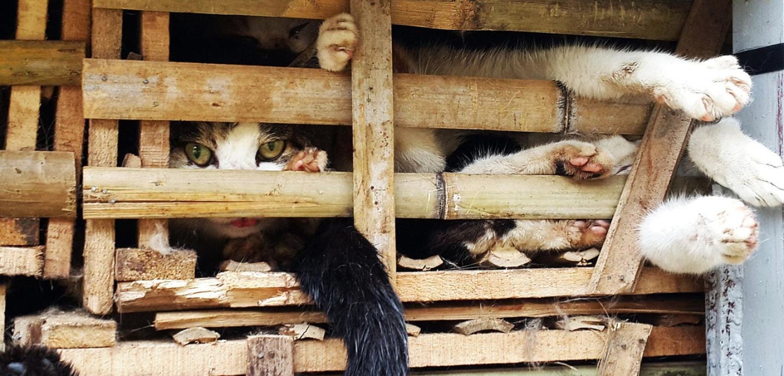 Los gatos estaban hacinados dentro de un camión en cajas de bambú, conteniendo tanto a animales vivos como a otros enfermos o muertos, y sumando en total unas tres toneladas de peso.