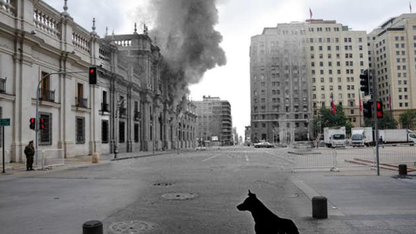 (Imágenes: @AndresPintaMono) El diseñador gráfico Andrés Cruzat buscó revivir lo ocurrido el 11 de septiembre de 1973 en su obra “La Persistencia de la Memoria”, donde combinó fotos actuales con las de esa fecha.