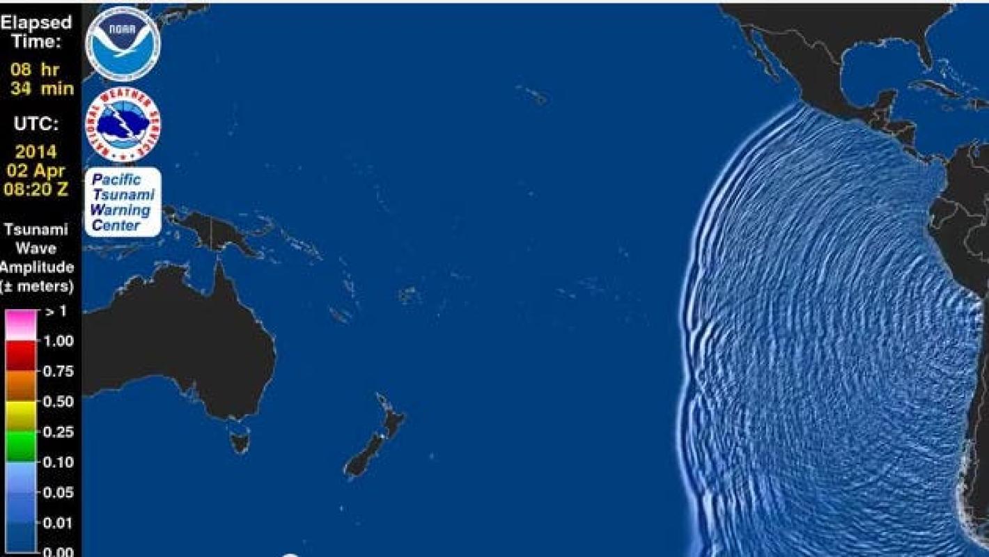La animación muestra una simulación de la propagación de las olas generadas por el sismo, hasta 30 horas después de que éste se registró.