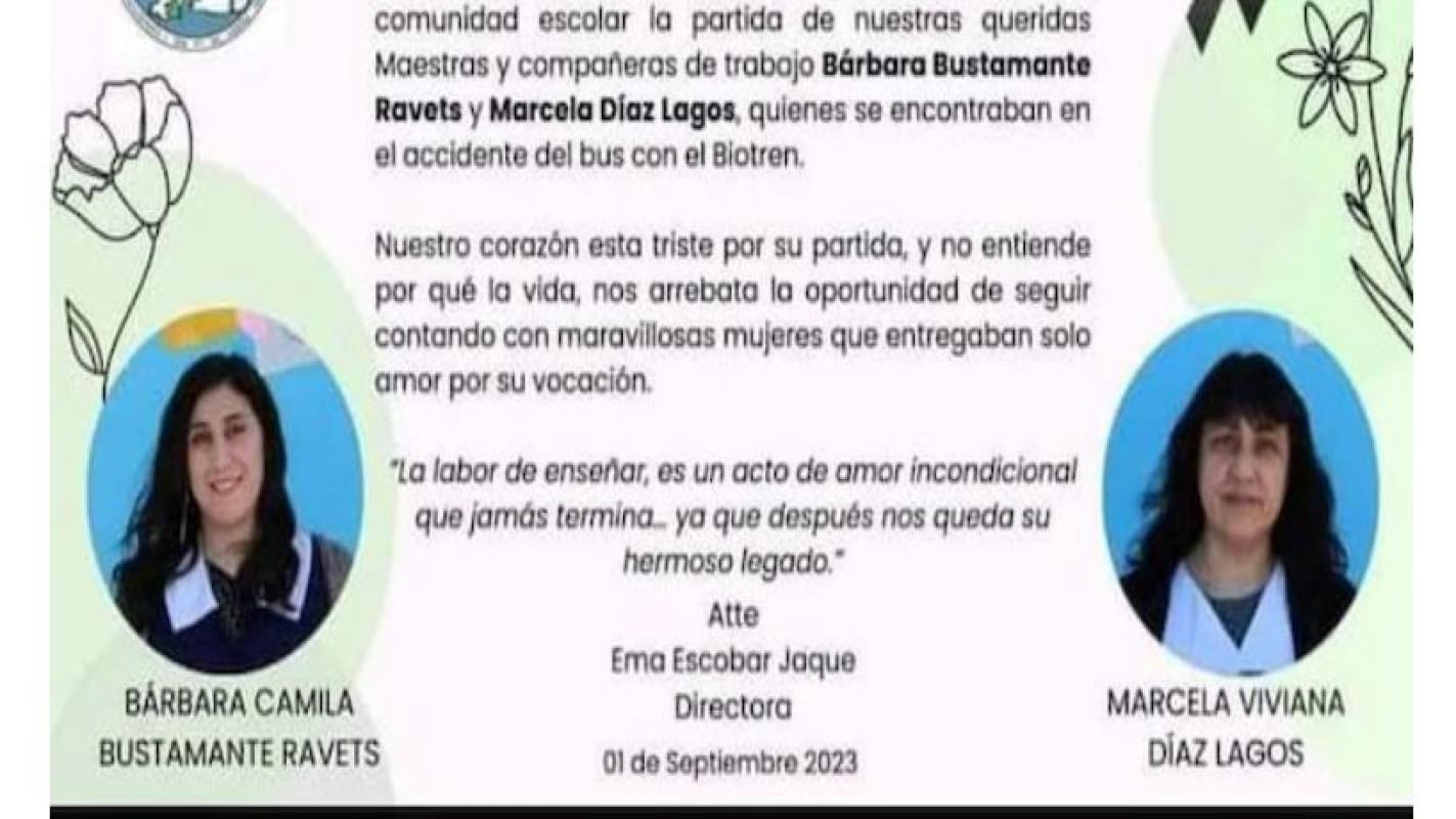 La Escuela Básica Colegio Nahuelbuta lamentó el fallecimiento de dos profesoras en el accidente entre un Biotrén y un microbus en San Pedro de la Paz, región del Biobío.