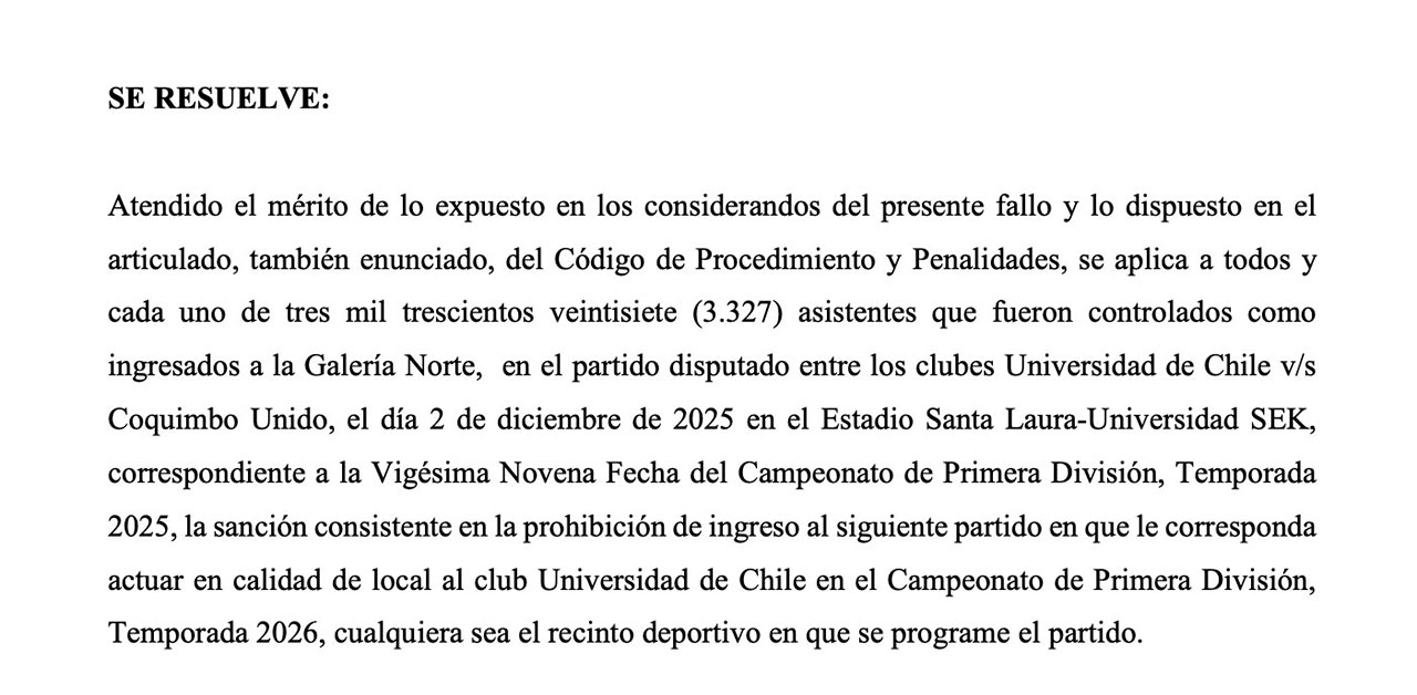 Universidad de Chile comienza la última semana de enero con malas noticias. A través de un comunicado, el club informó sobre un castigo impuesto por el Tribunal de Disciplina de la ANFP tras los incidentes ocurridos durante el partido ante Coquimbo Unido del pasado 2 de diciembre de 2025, donde se consignó la presencia de bengalas que interrumpieron el duelo durante algunos minutos.