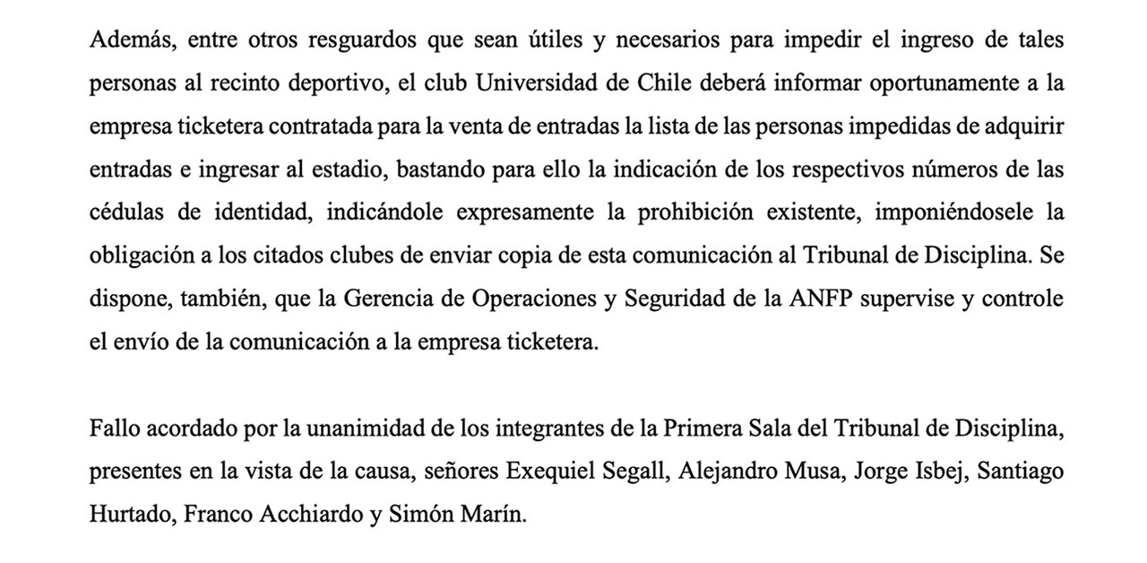 En el escrito, se detalla que se "sancionó con un partido a todos los asistentes que fueron validados ese día en la galería norte del Estadio Santa Laura".
