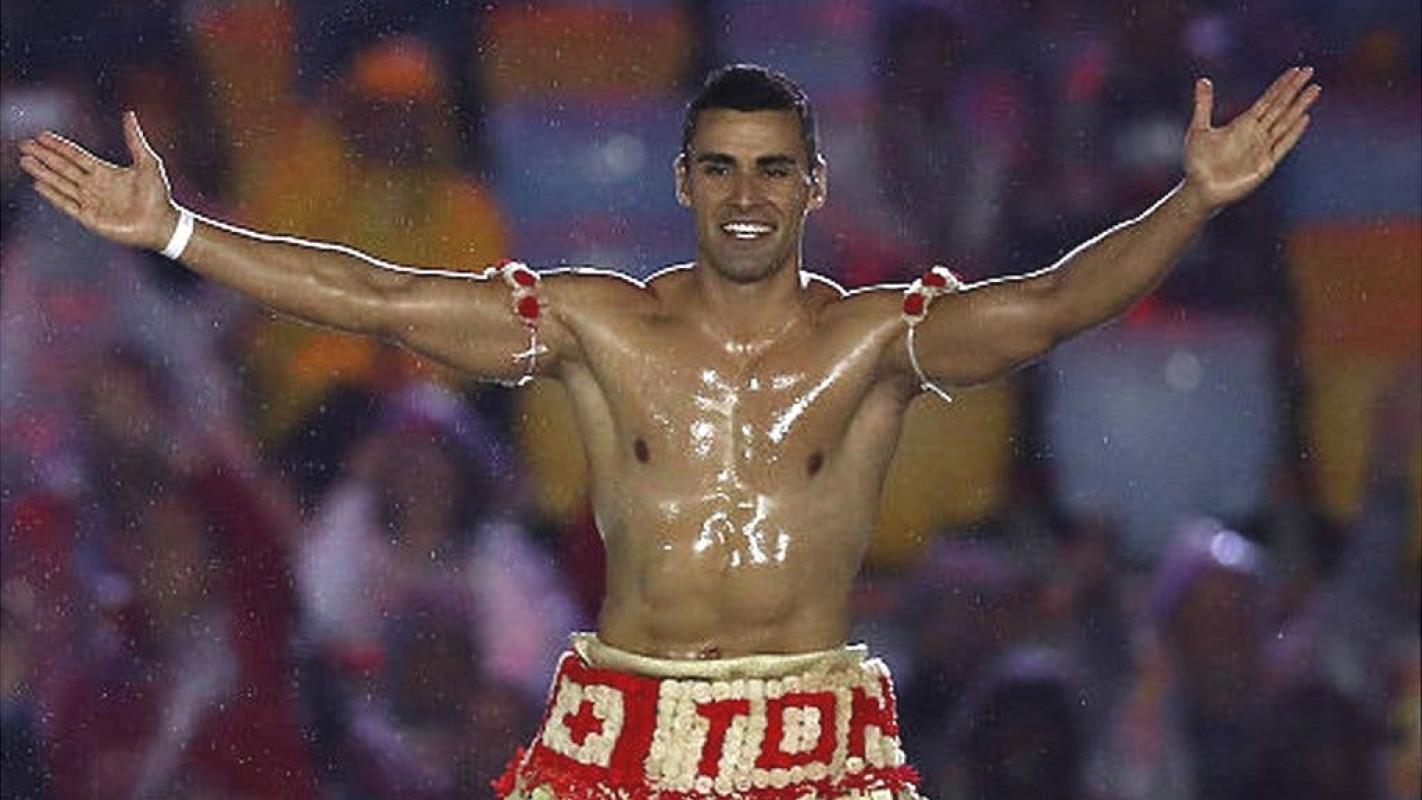 Durante la ceremonia inaugural de Río 2016, el taekwondista desfiló al frente del equipo de Tonga vestido de forma tradicional y con el torso desnudo y reluciente por el aceite de coco.