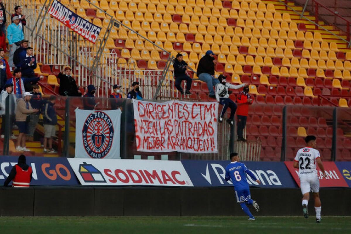 "Dirigentes CTM, bajen las entradas o mejor arranquen", decía el cartel colgado en la tribuna andes. Esta no es primera vez que se ven lienzos en contra de la dirigencia azul. Además de esto, todo el estadio cantó en contra de los directivos de Azul Azul: "Dirigentes, la con..., a ver si se dan cuenta que nos los quiere nadie", se escuchó en la "catedral del fútbol chileno".