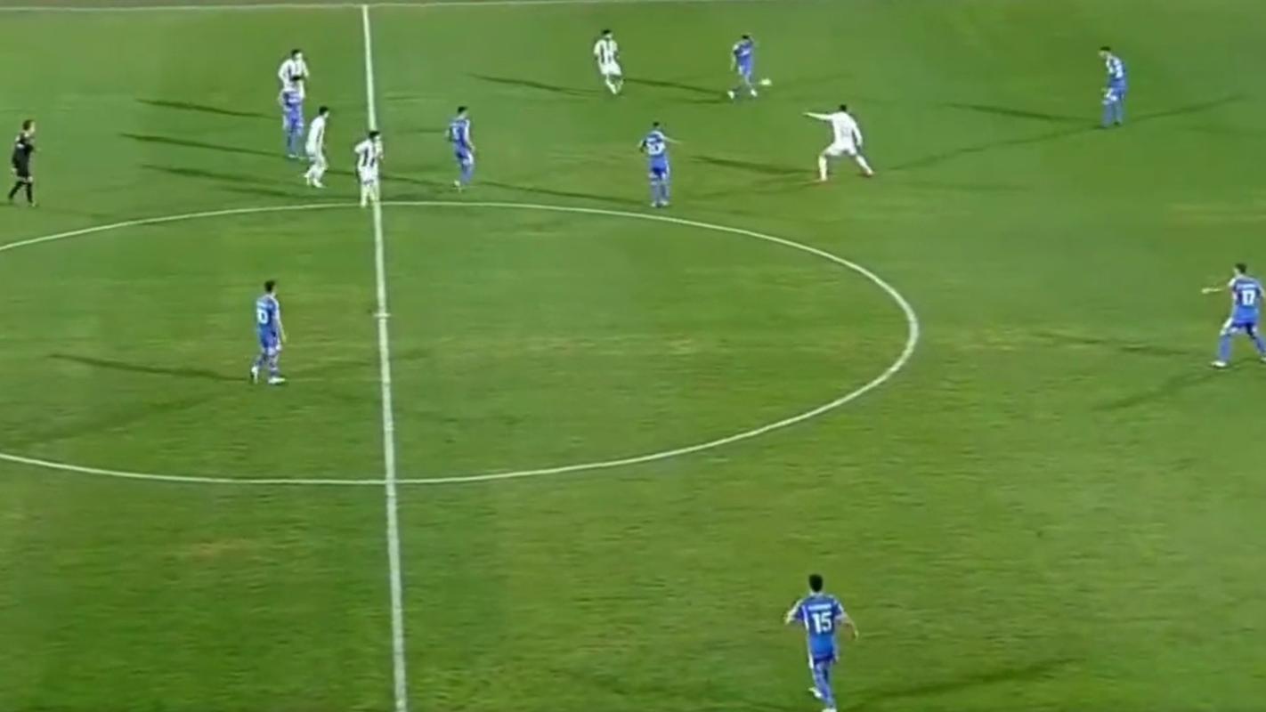 Mientras la U caía 3 a 1 frente a los rancagüinos, el zaguero decidió hacer un cambio de frente que no tenía destinatario. El balón no alcanzó a ser recibido por ninguno de sus compañeros y estuvo cerca de irse al córner.