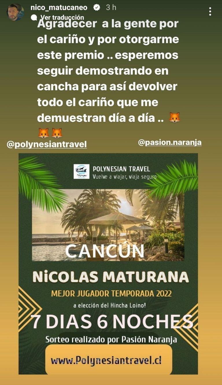 "Agradecer a la gente por el cariño y por este premio... esperemos seguir demostrando en cancha para así devolver todo el cariño que demuestran día a día", indicó Nico Maturana en sus redes sociales.
