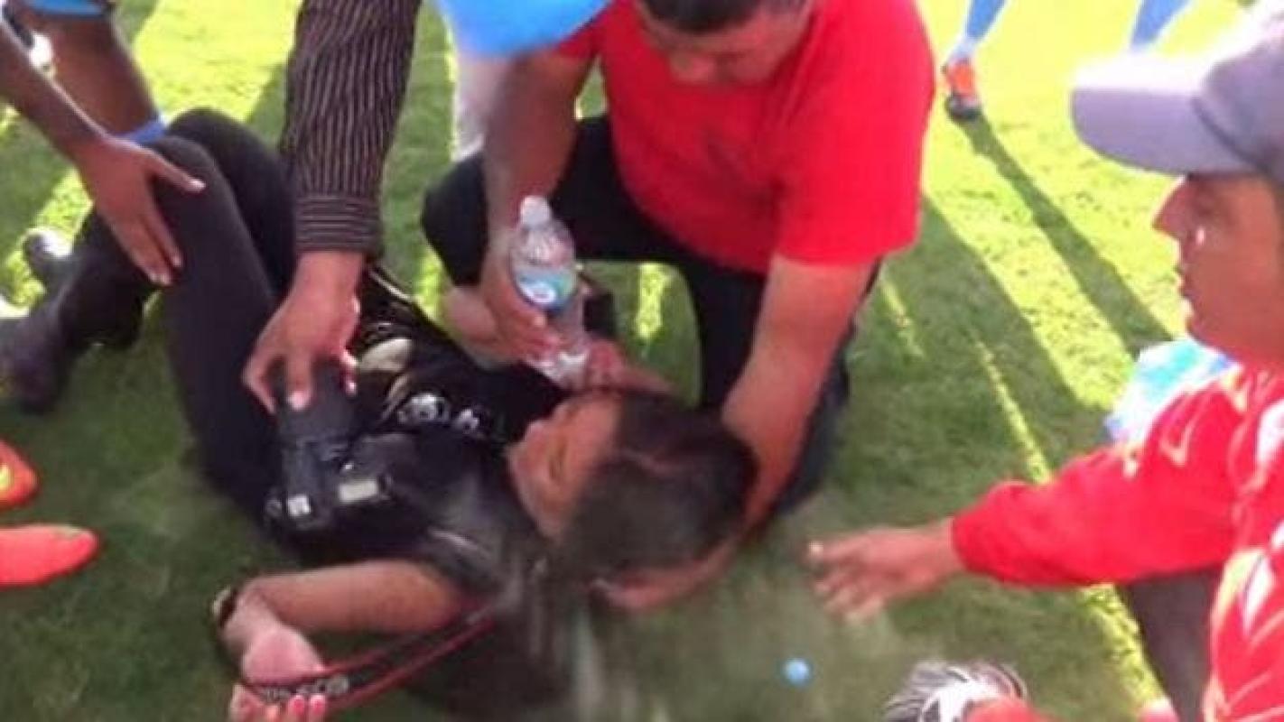 En redes sociales comenzó a circular un video donde la periodista Cintya Malparatida es atendida en el suelo tras haber sufrido un ataque producto de hinchas y un jugador.