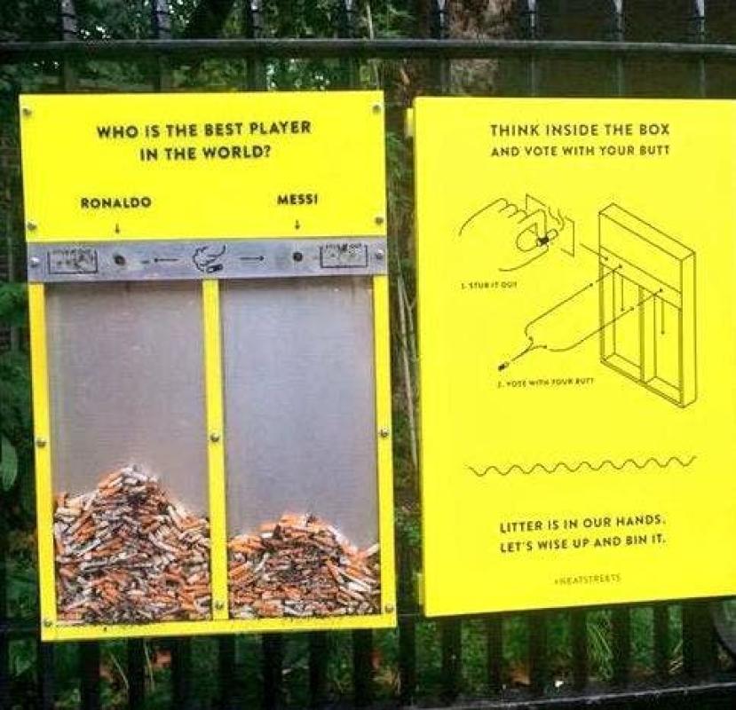 Una agencia de publicidad ideó este contenedor de colillas donde invitan a los londinenses a votar por Messi o Cristiano. Para formar parte de la campaña, hay que apagar el cigarrillo e introducir los residuos del cigarro en una de las dos urnas.
