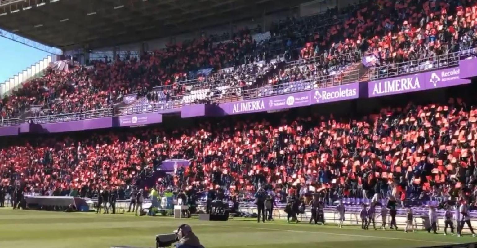 Apenas comenzó el encuentro los hinchas locales llenaron de tarjetas rojas el estado José Zorrilla, en protesta por las decisiones arbitrales a través del VAR, que los han perjudicado a lo largo del campeonato español.