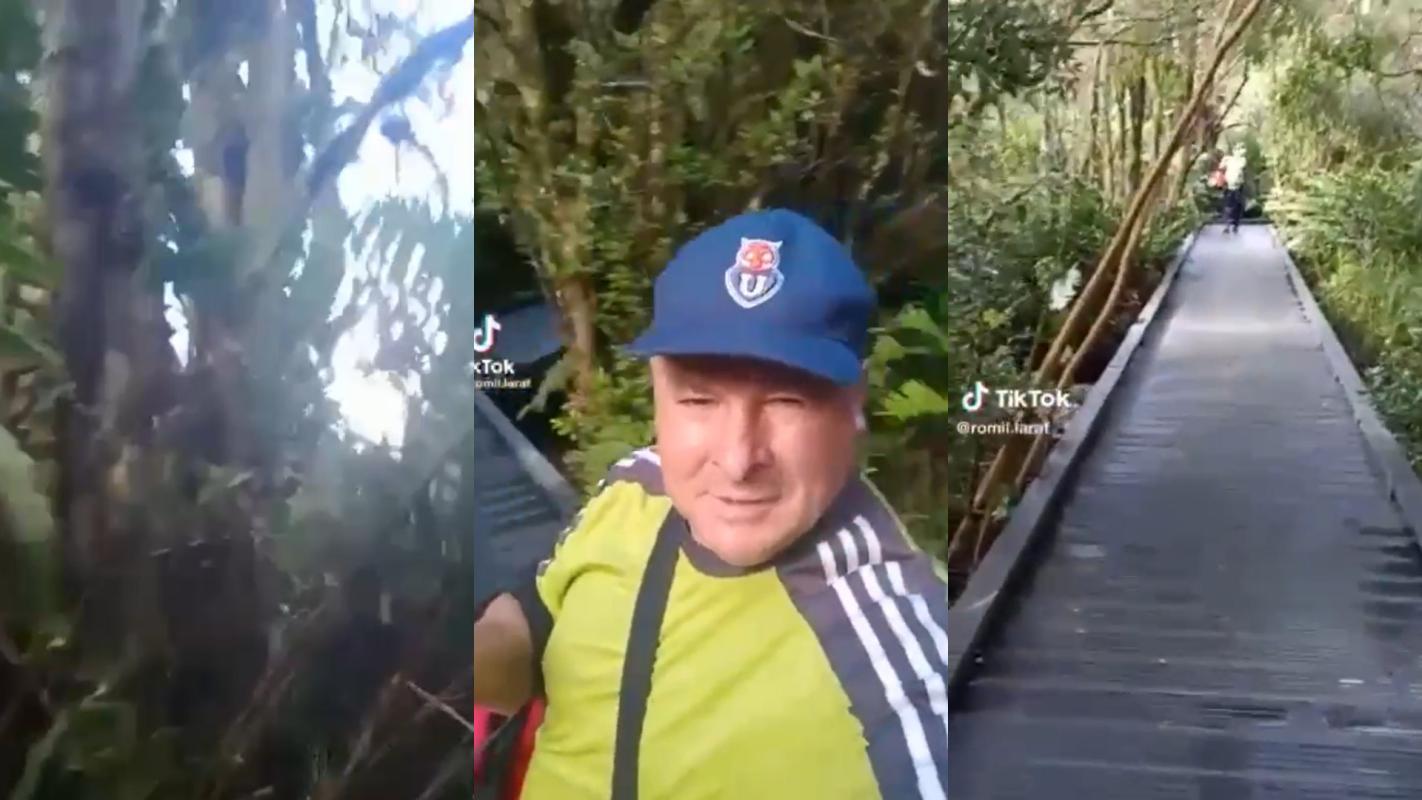 Con su gorro con la insignia de la U, el hombre mostraba el paisaje y no se percató que se terminaba el sendero. "Mira, mira, esto es Chile. Esto es una bendición", comienza diciendo cuando pierde el equilibrio y entre risas exclama un "ayayaisito", asumiendo que registró el chascarro.