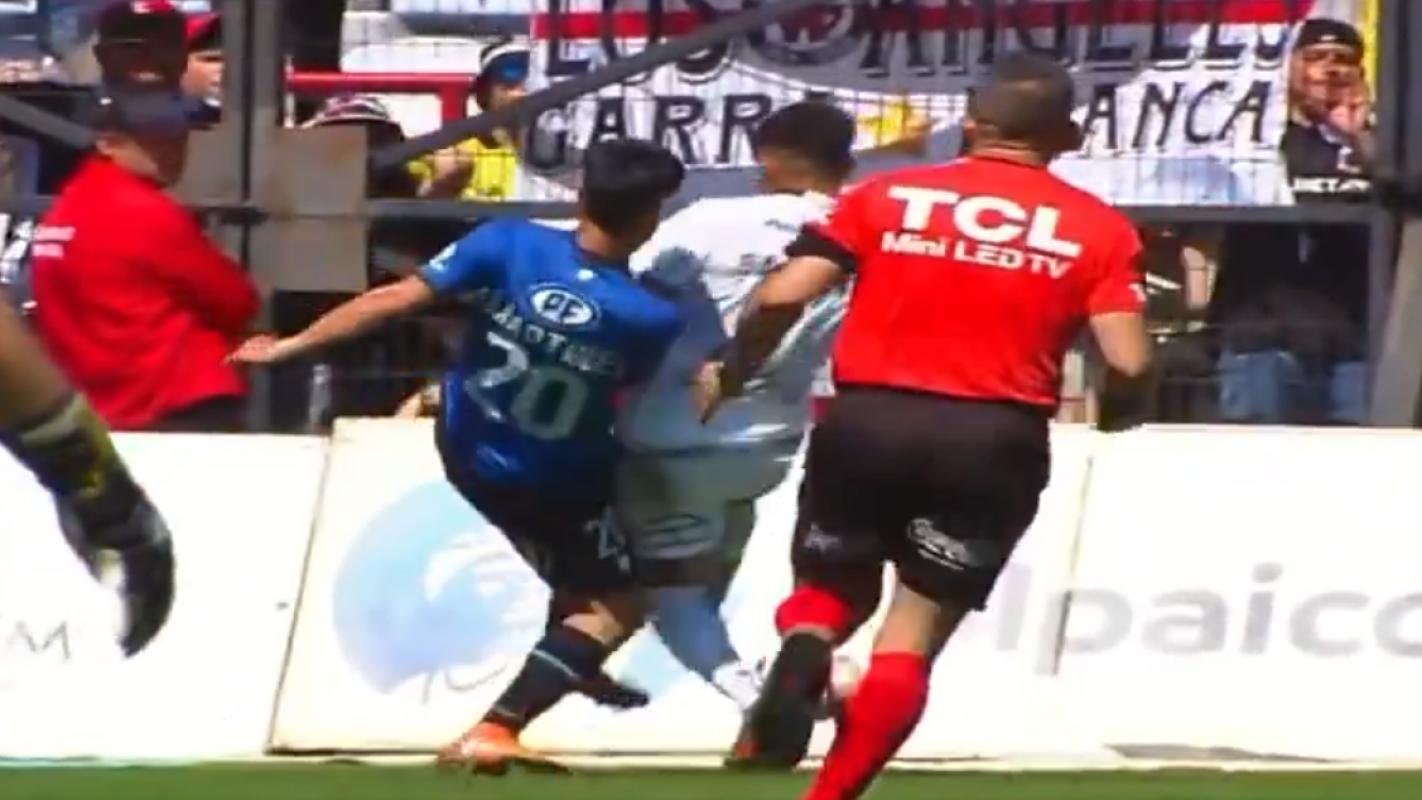 En el segundo tiempo, Alan Saldivia fue a la disputa del baló con Jimmy Martínez, quien quedó muy adolorido por un supuesto golpe del central de Colo Colo.