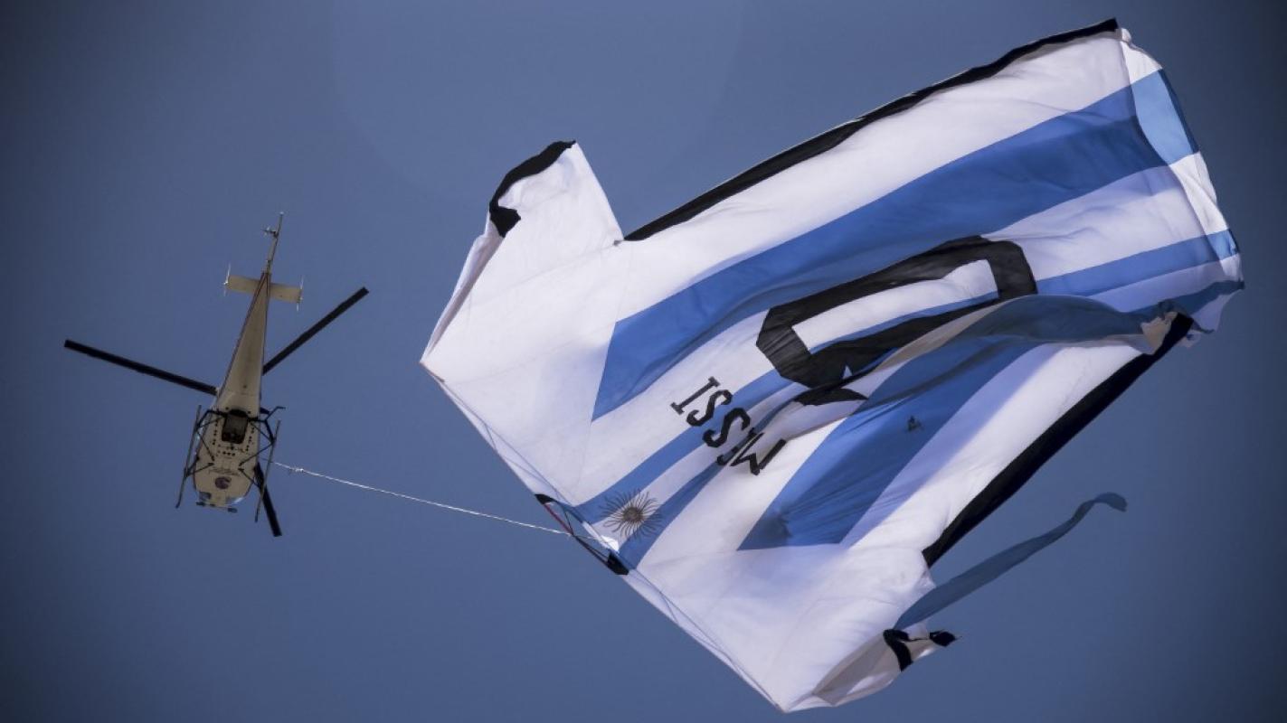 La indumentaria, de unos 18 por 12 metros, sobrevoló la ciudad donde nació el delantero de la 'Albiceleste'. Acontecimiento que emocionó a los habitantes de la ciudad trasandina en la previa al duelo correspondiente a la ronda de los 4 mejores.