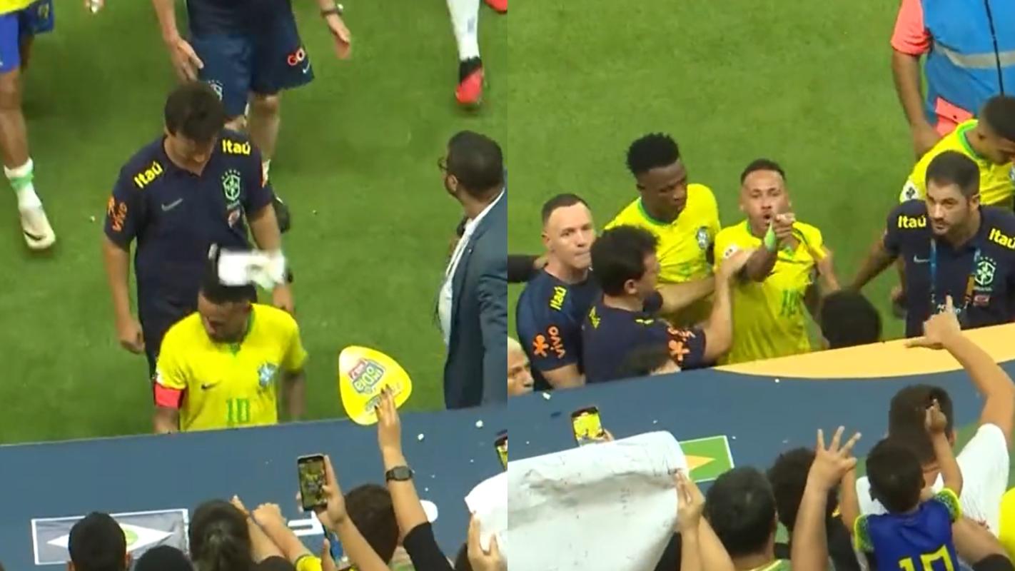 El '10' de Brasil no pudo evitar reaccionar y encaró a los fanáticos buscando al responsable de la cobarde agresión. Sus compañeros de la Canarinha intentaron calmarlo pero el futbolista tuvo un fuerte cruce con los asistentes que estaban más cerca.