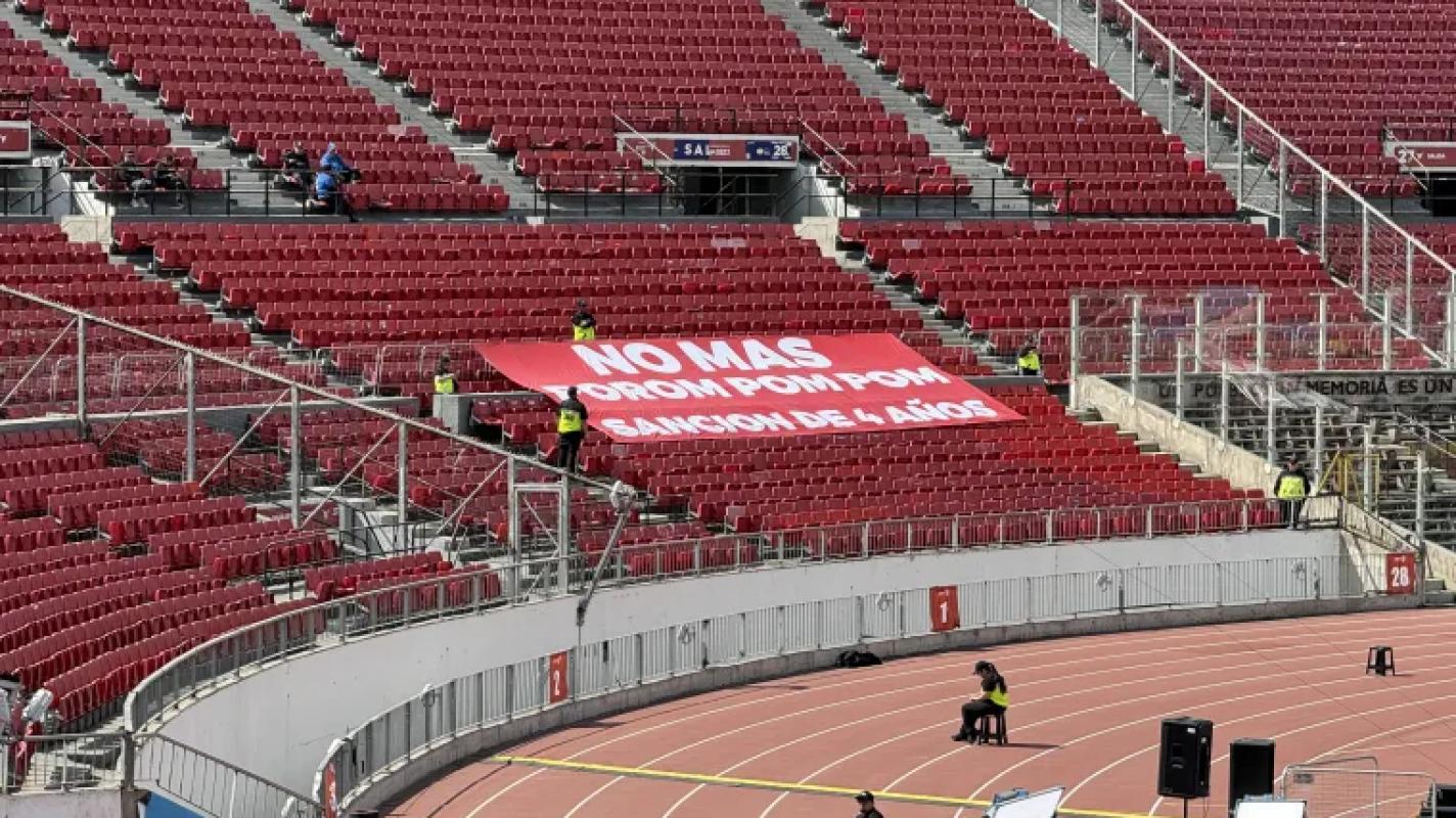 "No más porom pom pom. Sanción de 4 años", es uno de los tres lienzos que se pueden ver en la galería norte del Estadio Nacional. Algo inédito.