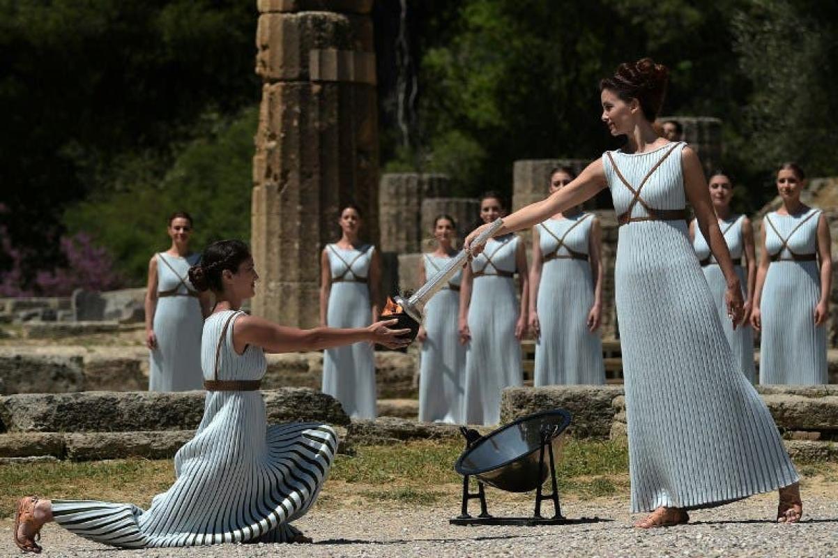 Tras este momento y en medio de una lenta coreografía, la “gran sacerdotisa” encendió la antorcha del primer relevista, el gimnasta griego Leftheris Petrounias, que pasará la antorcha a la ex jugadora brasileña de voleibol, Giovane Gavio.
