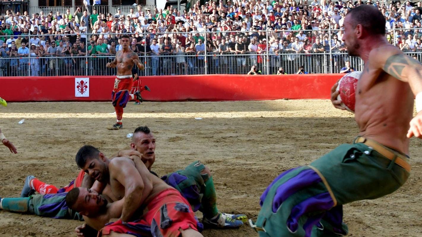 Agresividad en extremo que se da cita en la Piazza Santa Croce, en la tercera semana de junio en la que coinciden con las festividades de San Giovanni, patrono de Florencia. Una práctica que mezcla rugby, fútbol, artes marciales y lucha.