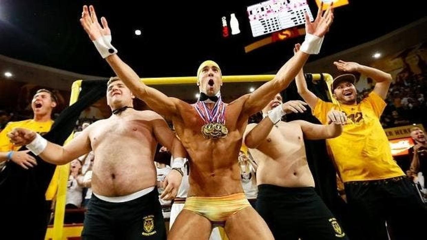 Dos aficionados sacaron en la grada una “cortina de distracción”, la abrieron y tras ella apareció el afamado nadador Michael Phelps, el hombre con más medallas olímpicas del planeta.