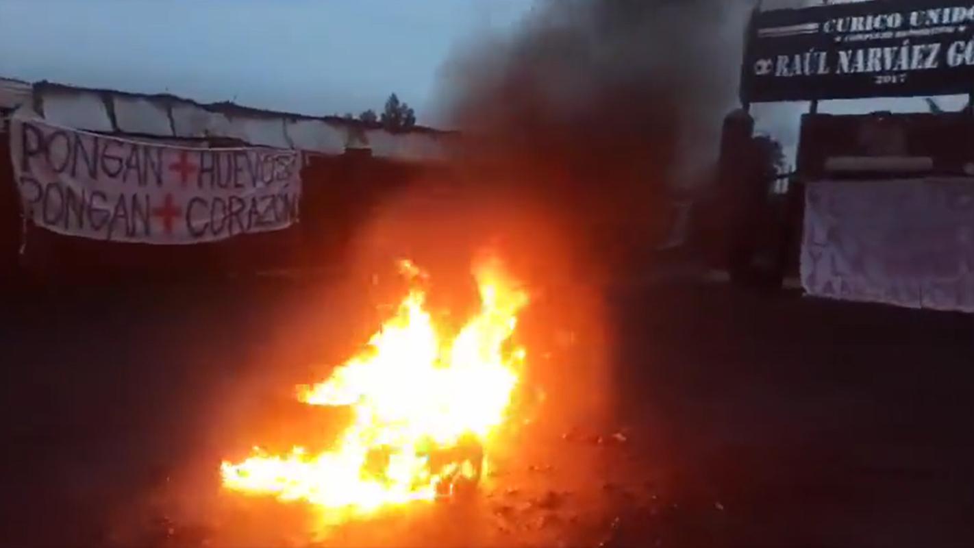 Fogatas y algunos lienzos que decían: "Pongan más huevo, pongan más corazón", "Respeten la camiseta y a la gente zánganos", fueron colgados por los hinchas de Curicó Unido en el recinto donde el plantel entrena.