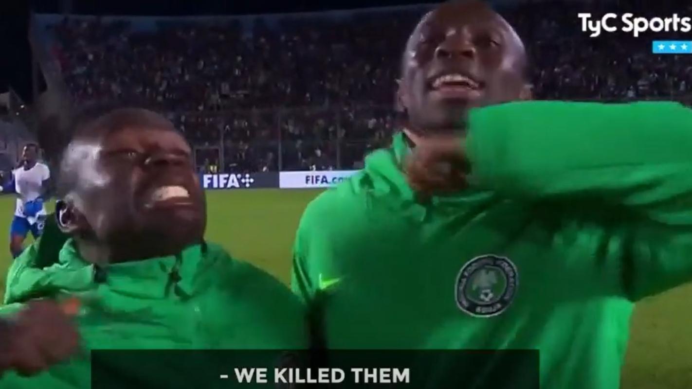 Finalizado el encuentro los vencedores hicieron una fiesta en el estadio San Juan del Bicentenario y uno de sus gestos causó verdadera indignación en el país trasandino. Los jugadores de Nigeria se acercaron a la cámara y aludiendo a la victoria señalaron que los "mataron" por el triunfo.