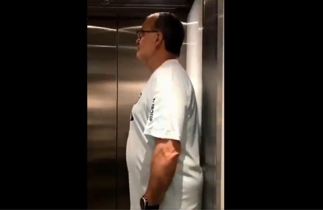 En el registro se puede apreciar a un hincha del Leeds, con la camiseta puesta, en un ascensor con nada más ni nada menos que Marcelo Bielsa en frente.