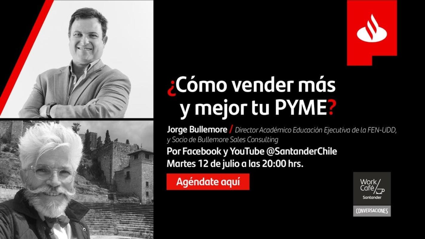 Te invitamos a conectarte a un nuevo capítulo de Conversaciones Work/Café este martes 12 de julio a las 20:00 horas. En esta ocasión, Federico Sánchez estará junto a Jorge Bullemore, director académico Educación Ejecutiva de la FEN-UDD, y socio de Bullemore Sales Consulting, y conversarán sobre cómo vender más y mejor tu pyme.