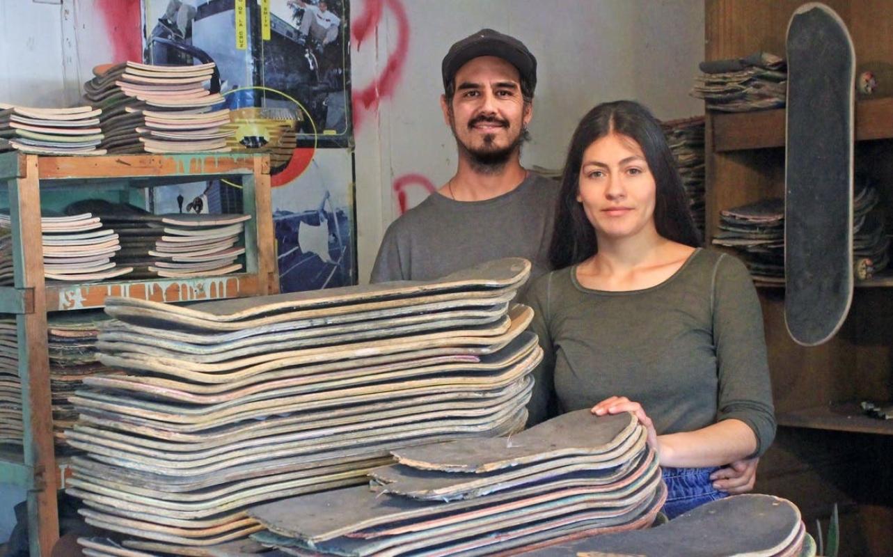 Otro expositor invitado que va en la senda del reciclaje es Juan Carlos Barrera, cofundador de Rubrum, empresa que cada año recupera unas dos mil tablas de skate rotas en el sector poniente de la capital y con su madera crea joyerías y objetos decorativos para el hogar.