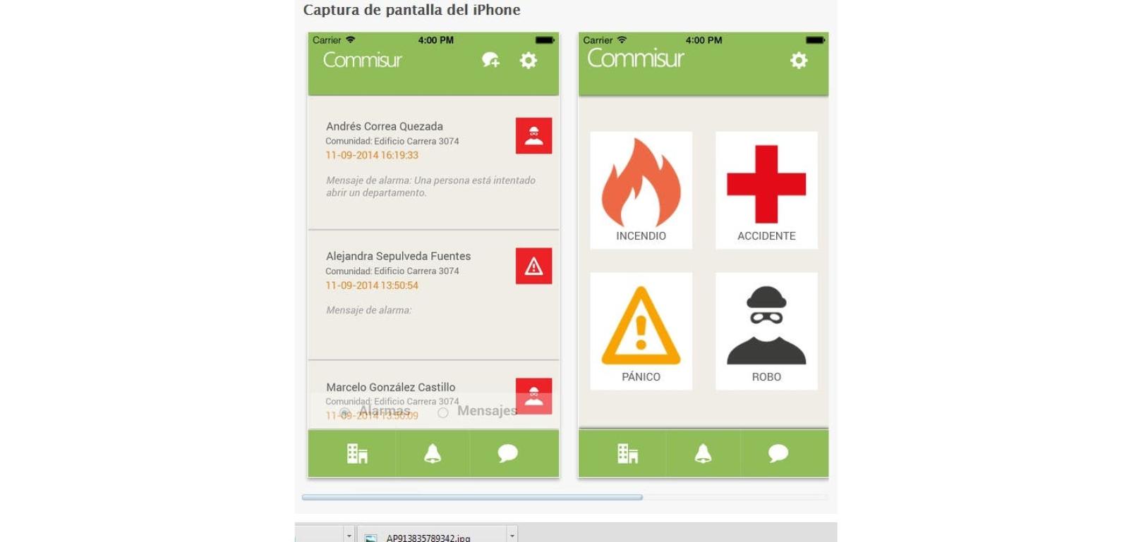 "Commisur genera comunidades de la casa, condominio, edificio o en la empresa. Si te pasa algo, tienes cuatro botones: incendio, accidente, pánico y robo. Al presionar alguno, el teléfono hace una reacción inmediata a los contactos de acuerdo a la comunidad en que estés. A las personas les va a sonar una alerta en medio segundo", explica Felipe Valdivia, fundador de Commisur, a T13.cl.