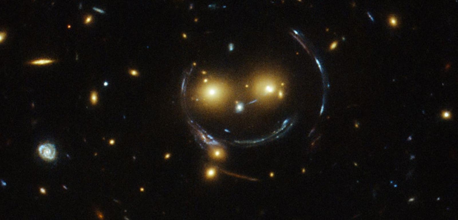 Los dos "ojos" de esta cara feliz son, de hecho, galaxias muy brillantes y el arco que se forma como una boca es, en realidad, un efecto conocido como "reflejo gravitacional intenso", que se produce cuando la masa-luz producida por las estrellas y galaxias pasa a través de un "lente cósmico".