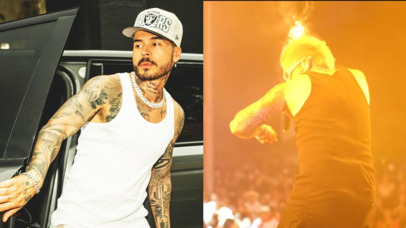 VIDEO | Cantante urbano Reykon fue alcanzado por el fuego de una máquina lanzallamas durante un concierto