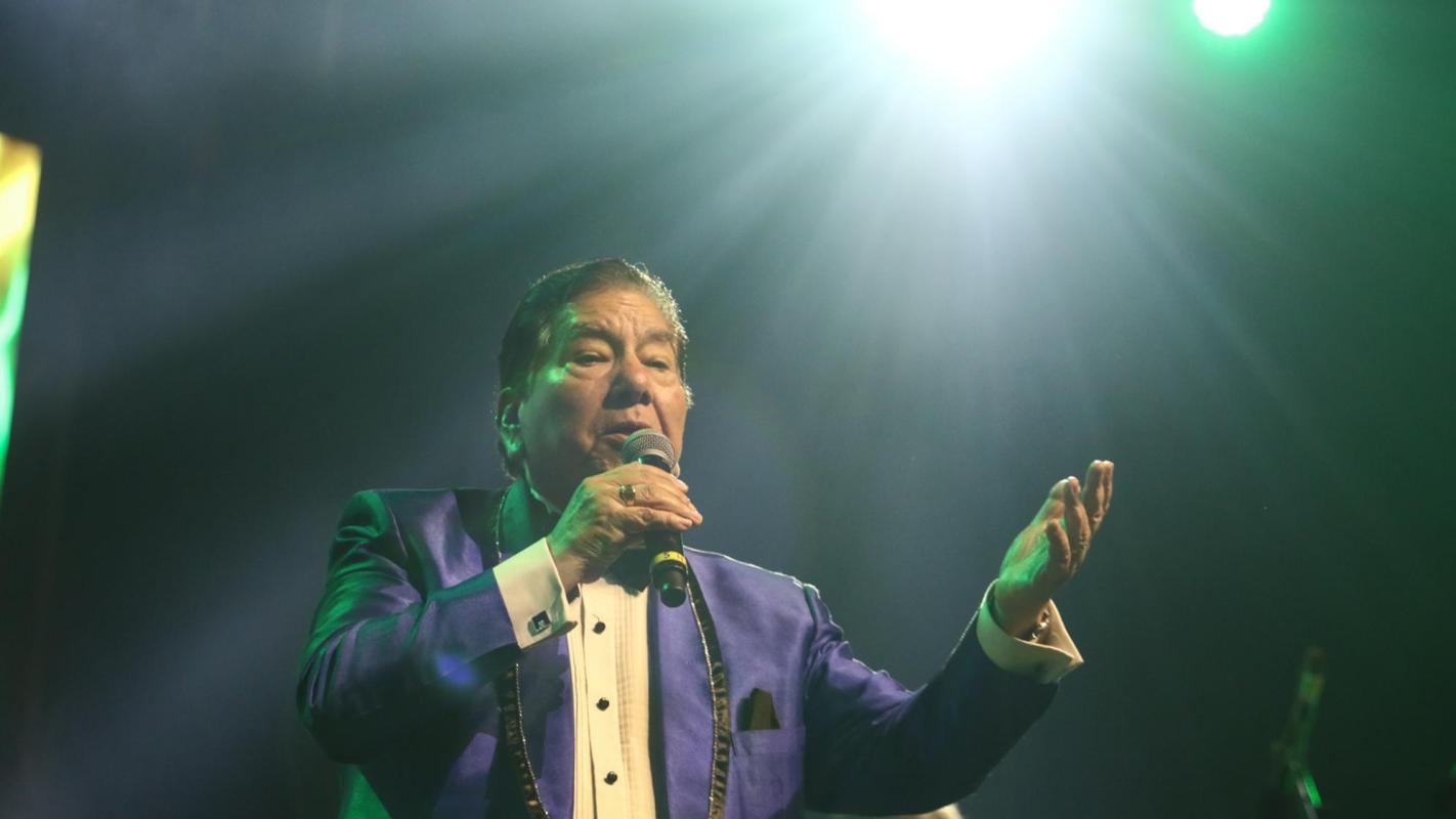 Mientras en el cielo se proyectaba la figura del cantante, su hijo estaba en el escenario principal del evento, junto a los integrantes de la Sonora Palacios.