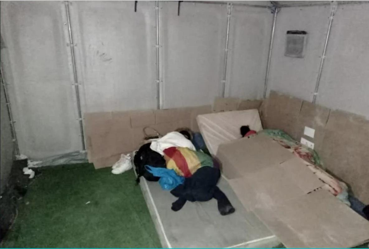 - En otra, registrada este domingo 10, se ve a un adulto arrodillado sobre un colchón en el piso de uno de los módulos. Aparecen también 2 personas acostadas, una de las cuales parece ser un niño. Las paredes están cubiertas parcialmente con cartones.