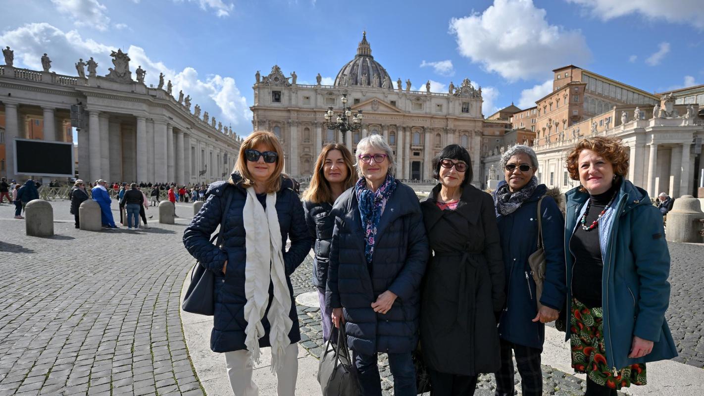 Margherita Romanelli y otras mujeres posan frente a la plaza de San Pedro
