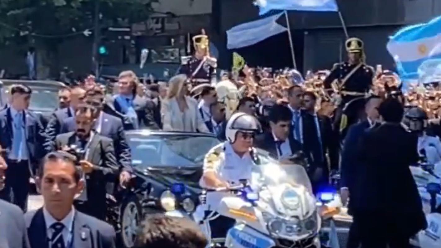 Una de las imágenes que ha dado vuelta en los medios trasandinos, en las primeras horas del gobierno de Javier Milei. Este lunes se dio a conocer el momento exacto en el que lanzan una botella al presidente argentino, cuando se trasladaba el domingo desde el Congreso argentino a la Casa Rosada, en Buenos Aires.