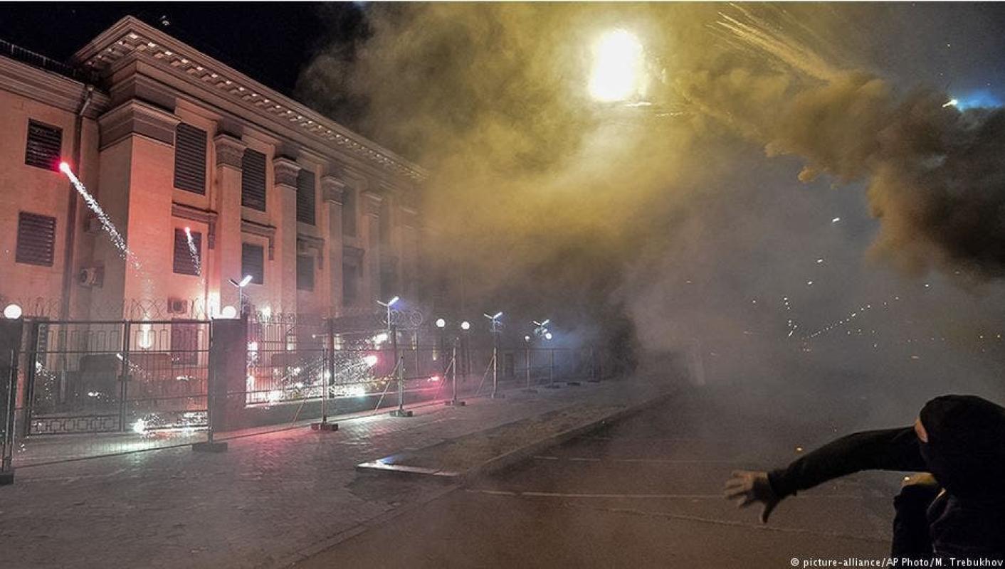 Un grupo de 20 jóvenes lanzaron fuegos artificiales y una bomba humo contra la embajada de Rusia en Kiev, capital de Ucrania. El ataque responde a la molestia de los ucranianos por la elección de parlamentarios a la Duma (Parlamento ruso) provenientes de Crimea, zona ucraniana anexada por Rusia en marzo de 2014.
