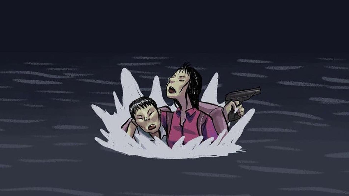 Jeon comenzó a nadar. Pero Kim no sabía cómo. Así, Jeon agarró su arma con una mano y arrastró a Kim con la otra.