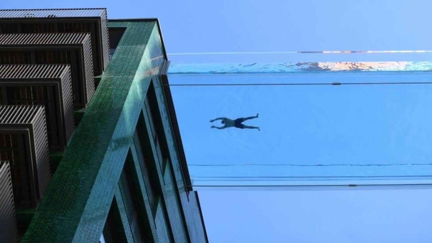 A 35 metros sobre el suelo flota una piscina con cristales transparentes y aguas turquesa que en los días soleados se llena de bañistas. Es la Sky Pool.
