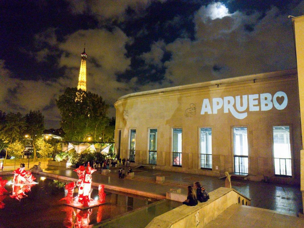 La acción consistió en la proyección - en español y francés - de las palabras “Apruebo”, el artículo sobre Derechos Sexuales y Reproductivos, derechos de la Naturaleza, derecho humano al Agua y el que establece a Chile como un Estado social y democrático de derecho, en la Plaza de Bastilla y la explanada del Palais de Tokyo, museo de arte contemporáneo en París cuya vista da a la Torre Eiffel.