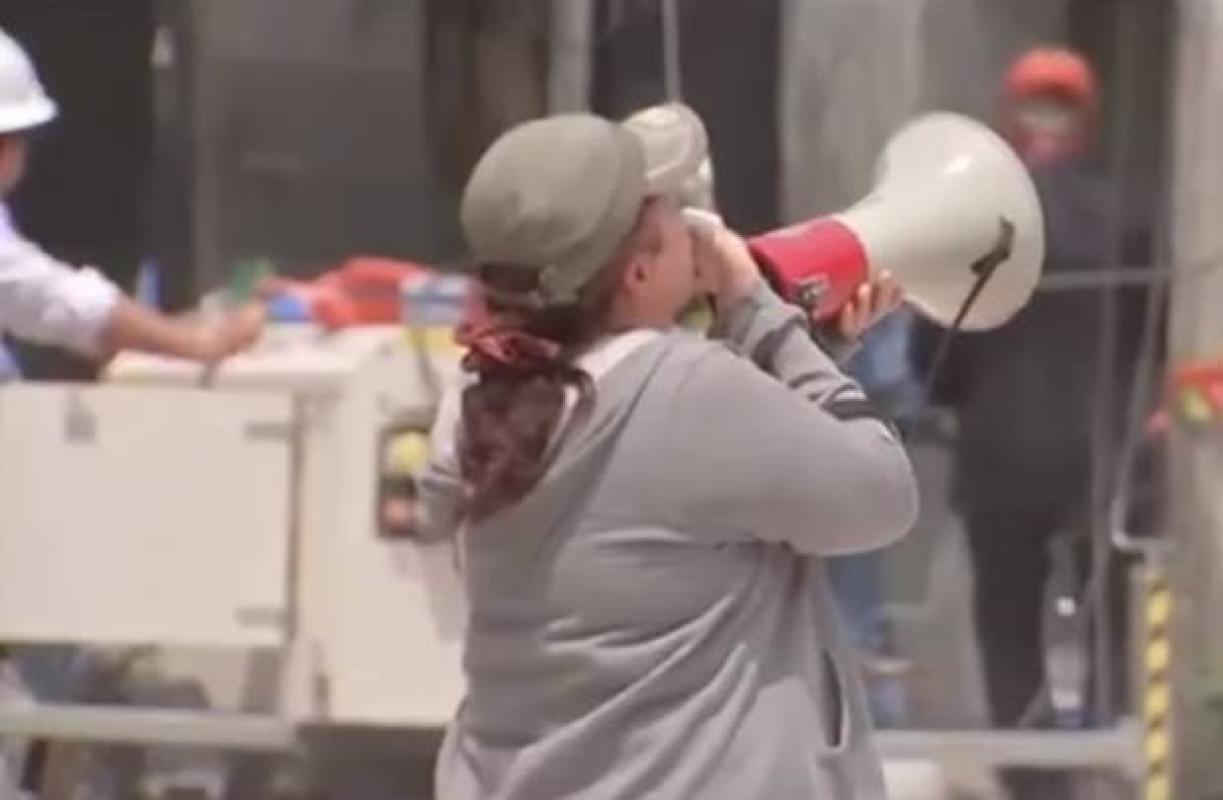 A través de un megáfono, Karina le envía mensajes de apoyo a su hermano quien se encuentra atrapado entre los escombros en el edificio derrumbado, ubicado en Medellín esquina con San Luis Potosí, en Ciudad de México, tras el terremoto que sacudió al país el pasado martes.