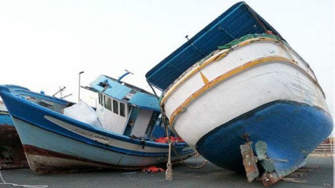 Los decrépitos pesqueros que trajeron a los migrantes desde el otro lado del Mediterráneo están apoyados sobre el cemento en extraños ángulos sobre el piso.
