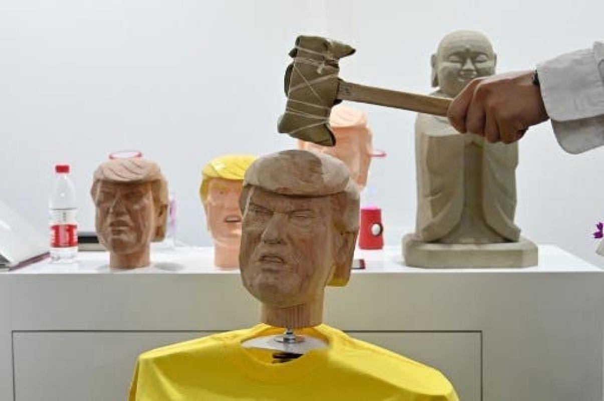 "Todavía sería mejor si pudieran utilizar las manos y los pies. Con el martillo no es tan divertido", explica Wang Dongyue, un visitante, tras haber dado un gran mazazo en la cabeza ficticia del presidente estadounidense.