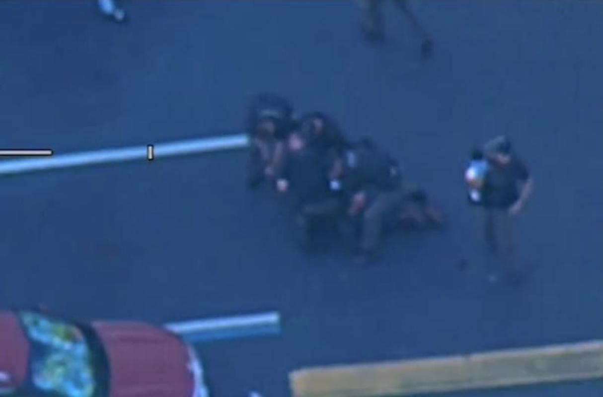 Los oficiales siguieron a James y trataron de detenerlo, pero sus intentos iniciales fallaron y la persecución continuó hasta que la policía finalmente lo atrapó con una tira de púas. James salió corriendo a pie y atravesó un complejo de apartamentos, con el niño en mano.
