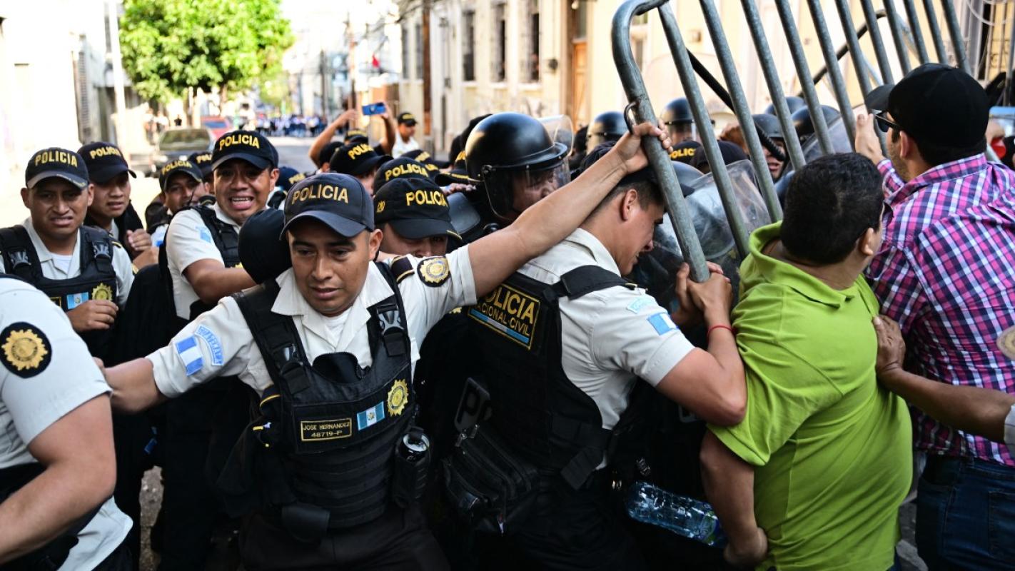 Los manifestantes, varios de ellos indígenas que llegaron a la capital, forcejearon con decenas de policías que mantenían dos cercos en la parte trasera del Palacio Legislativo, en en el centro histórico de Ciudad de Guatemala.