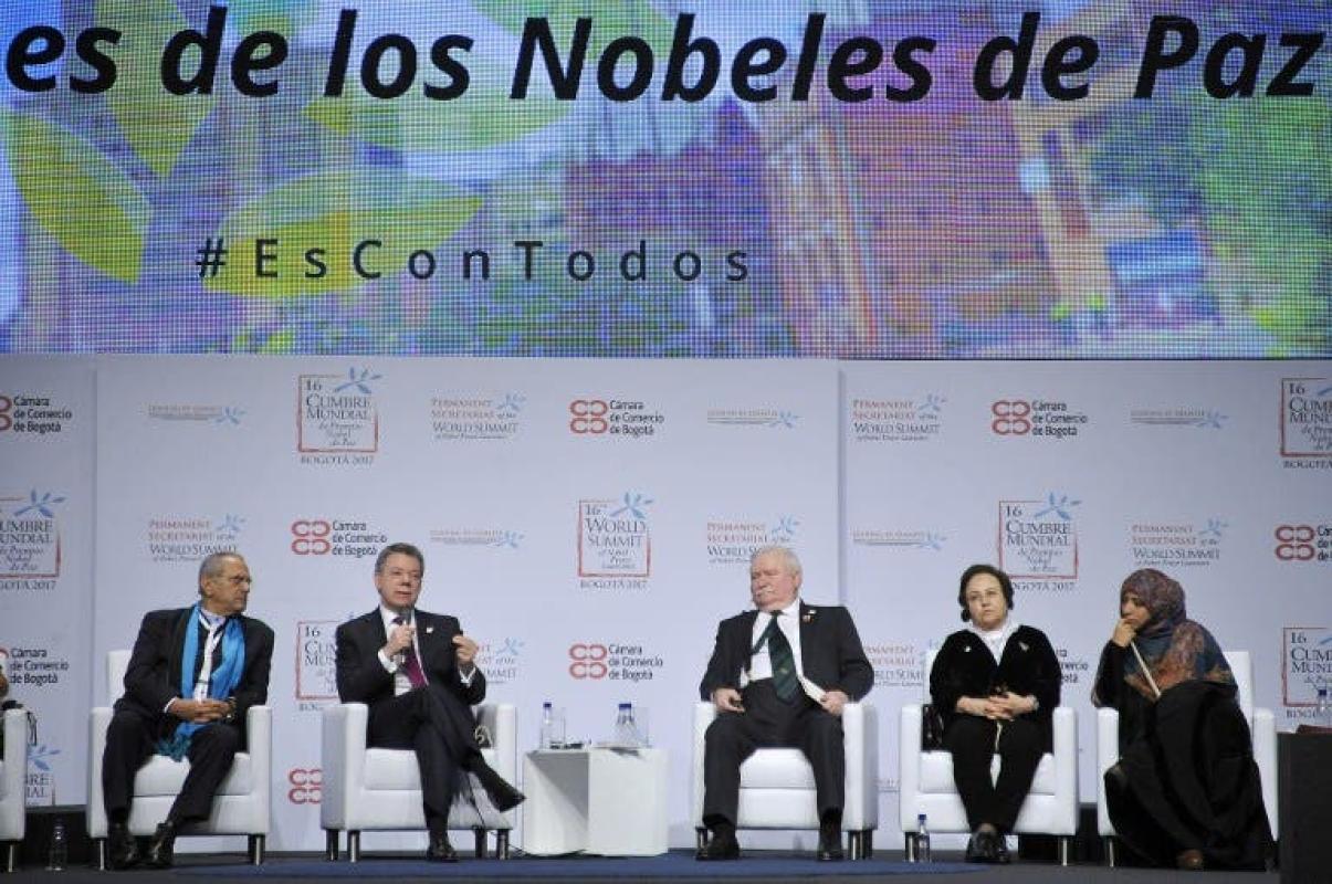En la cumbre de Bogotá, declarada durante el evento como "ciudad de la paz", participaron laureados como la guatemalteca Rigoberta Menchú, la iraní Shirin Ebadi y la liberiana Leymah Gbowee.