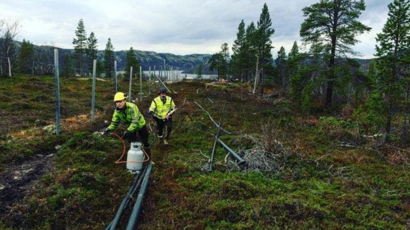 Dos contratistas están trabajando la maleza que hay en el lugar de la construcción, cerca del puesto fronterizo de Storskog.