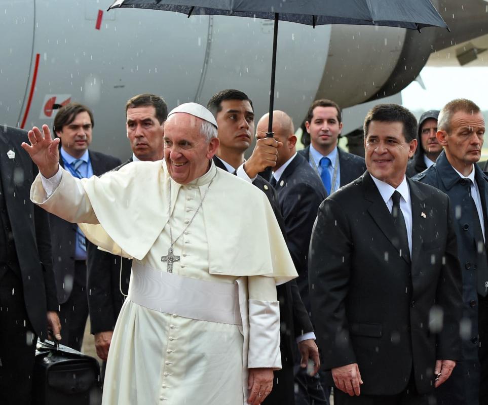 Esperado por el presidente Horacio Cartes, Francisco descendió del avión bajo un aguacero sin protegerse por un paraguas hasta que estrechó las manos de las autoridades paraguayas.