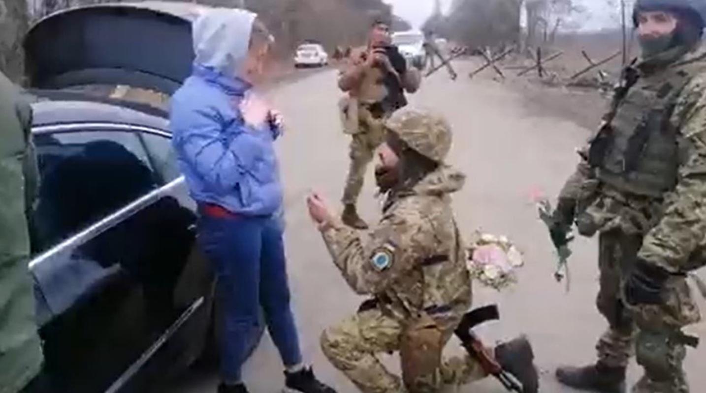 Un soldado ucraniano organizó un control militar falso para poder aprovechar de pedirle matrimonio a su novia, en medio del conflicto bélico con Rusia.