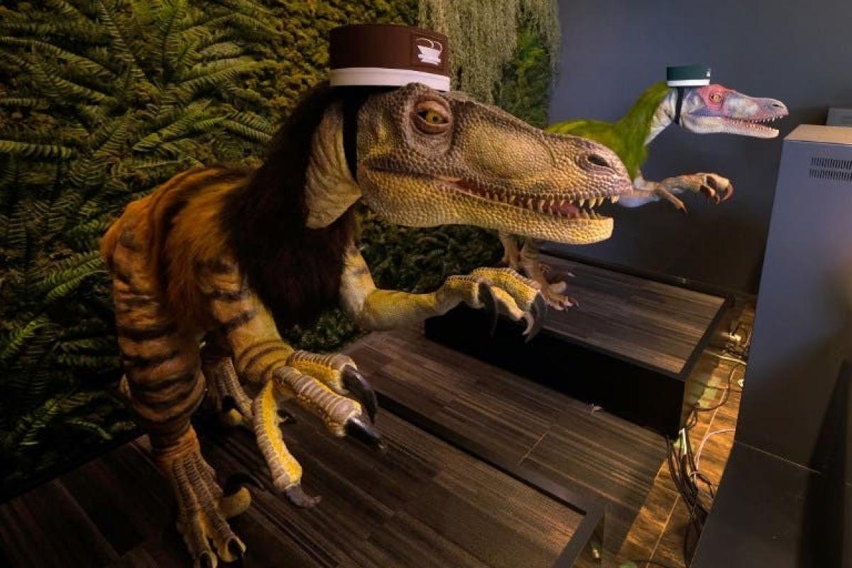 Dos dinosaurios, que parecen salidos del Parque Jurásico, tocados con un sombrero de mozo de equipajes, surgen de pronto alertados por un detector de movimientos, e invitan al cliente a registrarse en una pantalla táctil.